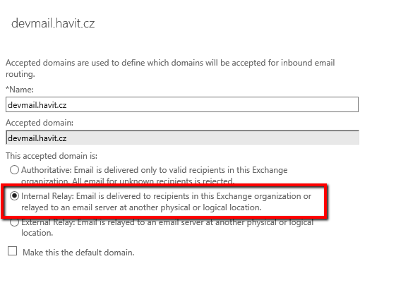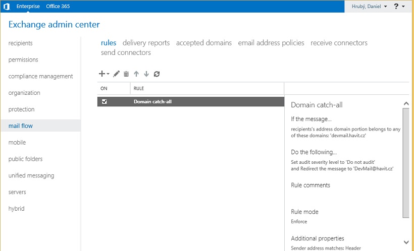 Přestože bylo pravidlo aktivní, všechny emaily zaslané do domény devmail.havit.cz vracely jako nedoručené s následující hláškou: domaincatchall@devmail.havit.cz