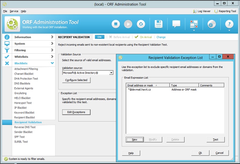 Začal jsem kontrolou konfigurace našeho SPAM filtering serveru, kde běží produkt ORF (který mohu s dobrým svědomím všem doporučit – používáme léta k naší plné spokojenosti). Bylo potřeba do nastavení přidat výjimku, jelikož jedno z aktivních pravidel a jeho výchozí nastavení nebylo kompatibilní s naším záměrem. Jedná se o Recipient validation které kontroluje zdali v organizaci existuje mailbox s daným emailem. Pokud neexistuje, tak ukončuje okamžitě SMTP relaci a nedochází k dalšímu zpracování emailu.