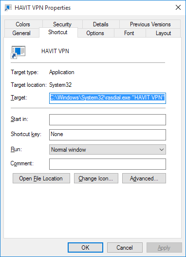 - Průvodci do pole Target dát C:\Windows\System32\rasdial.exe „Název VPN připojení“